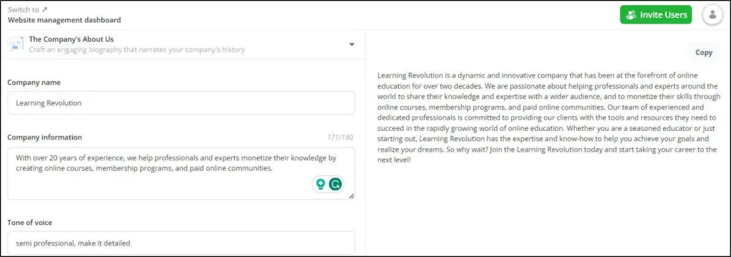 When creating website copy, you can also provide SEO keywords to ensure your content aligns with your optimization goals. This is particularly useful for improving your site’s organic visibility while saving hours of manual work.